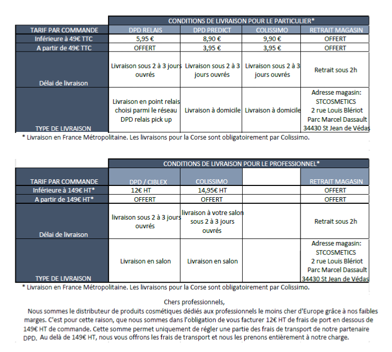 Les commandes s’effectuent uniquement par email à l’adresse suivante : contact@st-cosmetics.fr. La livraison, et le SAV sont assurés directement par la société POSTQUAM sise à Ctra. Burgos-Portugal, Km 115, 47370 Cigales-Valladolid, Espagne.